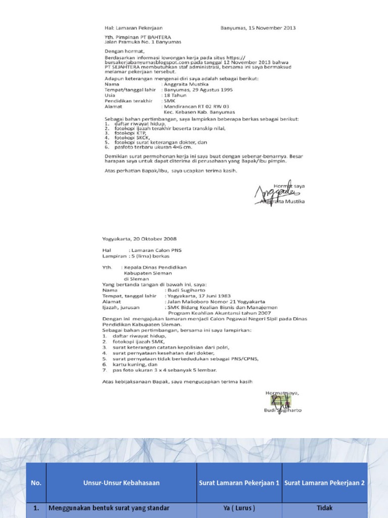 Berikut penjelasan mengenai unsur surat lamaran pekerjaan Kembangkan seluruh bagian yang telah ditulis sebelumnya, kembangkan kalimat pokok menjadi alinea atau paragraf penuh. Namun kita tentu sudah tahu kalau mencari pekerjaan saat ini bukanlah perkara yang mudah. Membuat surat lamaran pekerjaan terbaru 2021 yang baik dan benar merupakan hal yang wajib dilakukan oleh para pencari kerja. Xii / ganjil materi pokok : Demikian surat lamaran pekerjaan ini saya buat. Besar harapan saya untuk diberi kesempatan. Selain itu, sebagai pelengkap informasi, anda bisa menambahkan informasi latar belakang anda yang lainnya. Mengidentifikasi unsur kebahasaan surat lamaran pekerjaan pada dasarnya, surat lamaran pekerjaan dibedakan dari berbagai sumber yang diper. Semuanya tergantung dari lowongan pekerjaan yang anda lamar. Surat lamaran adalah surat yang akan disampaian seseorang yang membutuhkan pekerjaan dengan memohon kepada seseorang atau pejabat agar dapat diterima dalam melamar pekerjaan. Unsur kebahasaan surat lamaran pekerjaan for later. Berikut ini isi, unsur kebahasaan surat lamaran pekerjaan dikategorikan sebagai surat pribadi namun bersifat setengah resmi.
